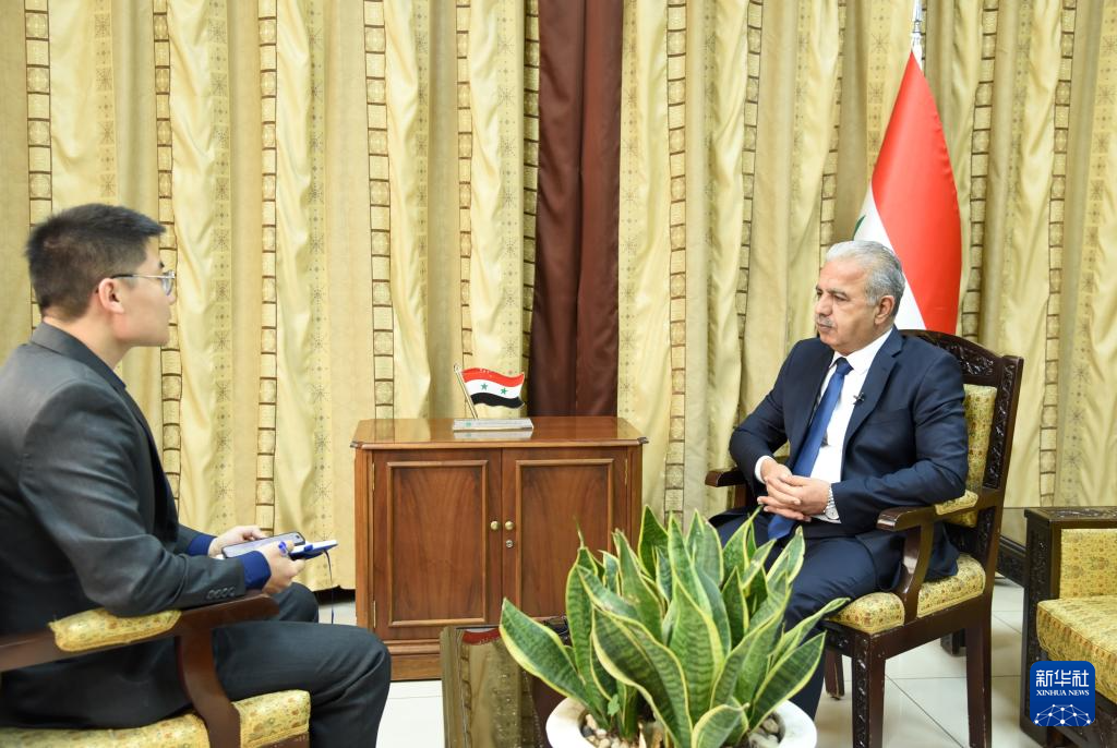 5月13日,在叙利亚首都大马士革,叙利亚电力部长加桑·扎迈勒(右)接受新华社记者专访。新华社发(蒙塞夫·梅马里摄)