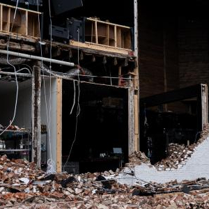 5月17日,在美国休斯敦市中心,工作人员查看一座被破坏的酒吧。当地时间16日晚,暴风雨席卷休斯敦,带来大面积破坏。新华社发(陈晨摄)