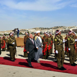 5月22日,在约旦安曼马尔卡机场,约旦国王阿卜杜拉二世(中左)为到访的阿曼苏丹海赛姆(中右)举行欢迎仪式。