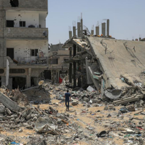 5月21日,在加沙地带南部城市汗尤尼斯,巴勒斯坦人经过以军轰炸后的废墟。(新华社发 里泽克·阿卜杜勒贾瓦德摄)