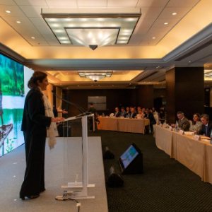 5月24日,希腊前文化和体育部长莉迪娅·科尼奥尔祖(左一)在雅典举办的“良渚古城·雅典卫城”文明对话交流活动上致辞。新华社发(马里奥斯·罗洛斯摄)