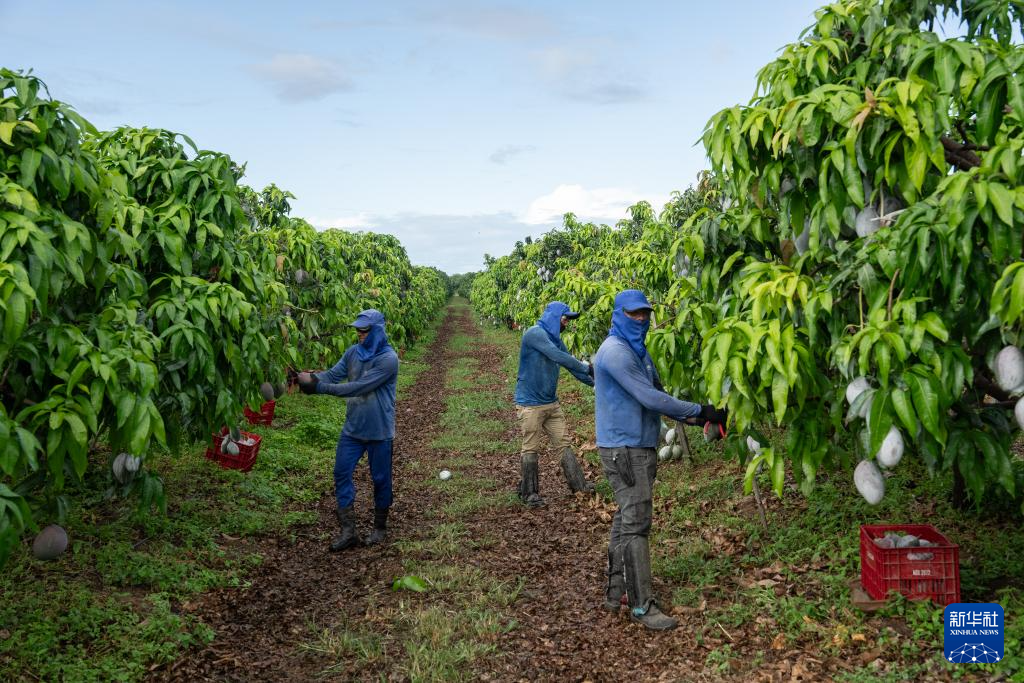 5月21日,工作人员在巴西伯南布哥州圣弗朗西斯科河畔贝伦的一处农场采摘芒果。新华社记者 王天聪 摄