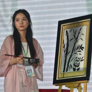 5月25日,在越南河内举行的第23届“汉语桥”世界大学生中文比赛越南北部及中部赛区决赛上,来自河内师范大学的韦氏如琼展示水墨画。