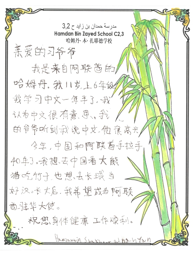 哈姆丹学校6年级的学生哈姆丹在信中写道:“今年,中国和阿联酋手拉手40年了。”他向习爷爷表达自己的心愿——将来“成为阿联酋驻华大使”。收到复信后,他特别激动和感动,“恨不得明天就去中国”。“如果未来我成为阿联酋驻华大使,我想促进阿联酋和中国在科技,特别是航天领域的交流和合作,希望我们两国的宇航员能一起探索宇宙。”