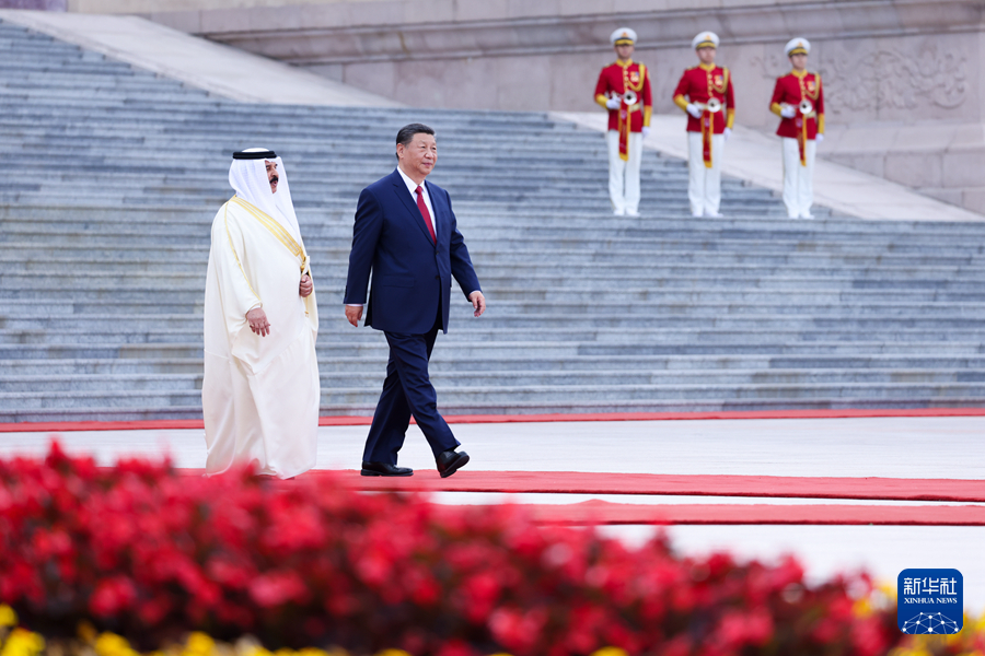 5月31日下午,国家主席习近平在北京人民大会堂同来华国事访问并出席中阿合作论坛第十届部长级会议开幕式的巴林国王哈马德举行会谈。这是会谈前,习近平在人民大会堂东门外广场为哈马德举行欢迎仪式。新华社记者 张领 摄