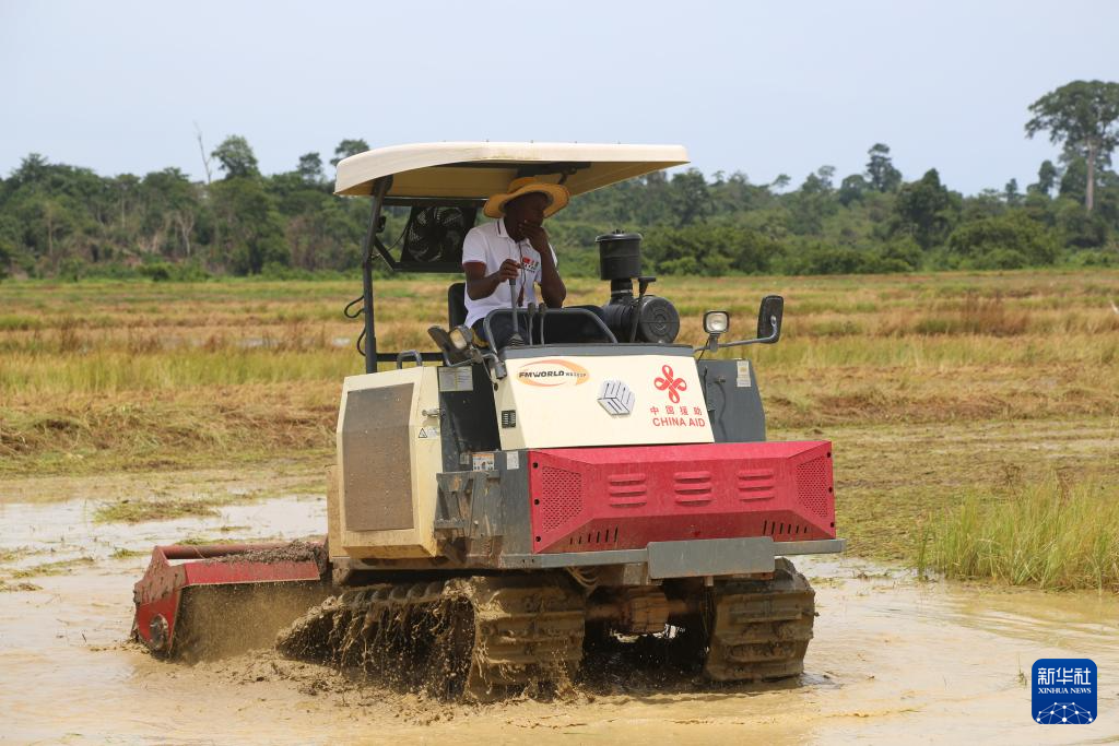 5月31日,在位于科特迪瓦南部迪沃省的格格杜垦区,当地种植户在水稻田里操作农机作业。新华社记者 张健 摄