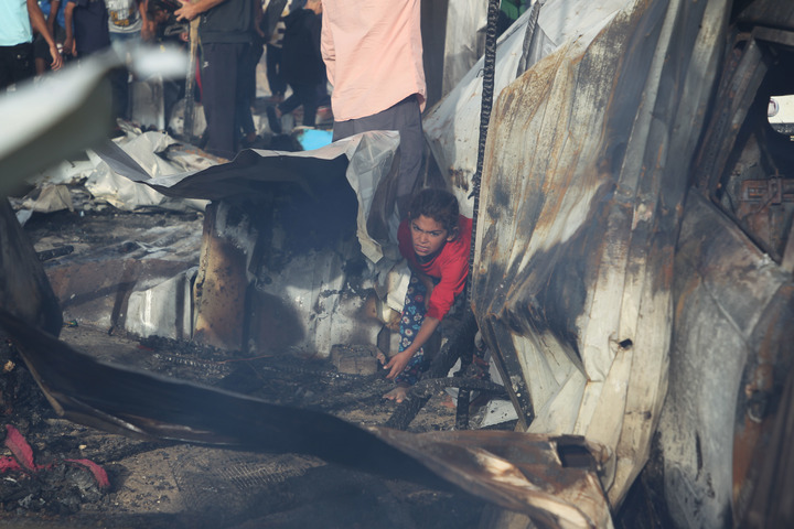 5月27日,一名女孩在加沙地带南部城市拉法查看以军轰炸后的难民营废墟。新华社发(哈立德·奥马尔摄)