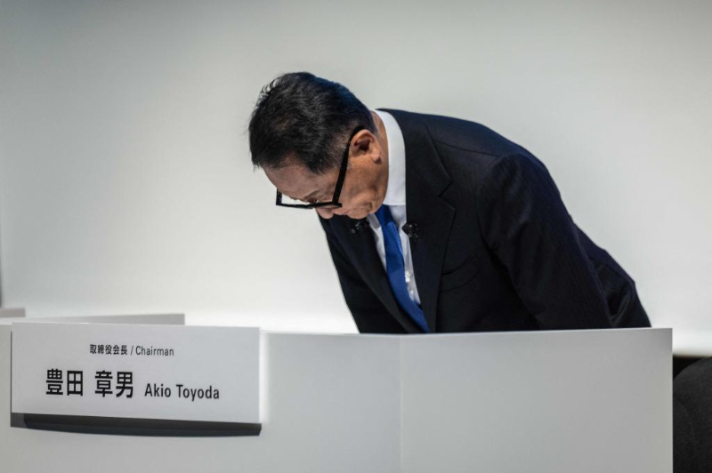 6月3日,丰田汽车公司会长(董事长)丰田章男在东京召开的记者会上鞠躬道歉。新华社/法新