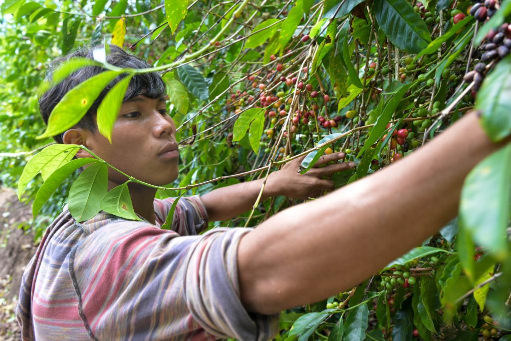 2月19日,在位于巴拿马奇里基省博克特地区的彼德松家族庄园内,一名工人在采摘咖啡豆。新华社记者陈昊佺摄