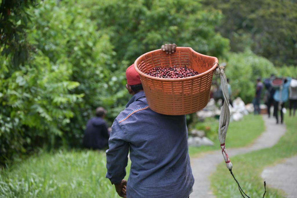 2月19日,在位于巴拿马奇里基省博克特地区的彼德松家族庄园内,一名工人在搬运刚采摘的咖啡豆。新华社记者陈昊佺摄