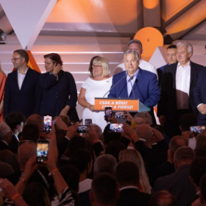 6月10日凌晨,匈牙利总理欧尔班(中)在匈牙利首都布达佩斯举行的集会上发表讲话。欧尔班领导的执政联盟(青民盟和基民党)以43.76%的得票率领先,预计将获得匈牙利在欧洲议会21个席位中的11席。新华社发(弗尔季·奥蒂洛摄)