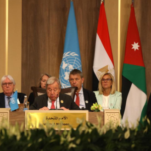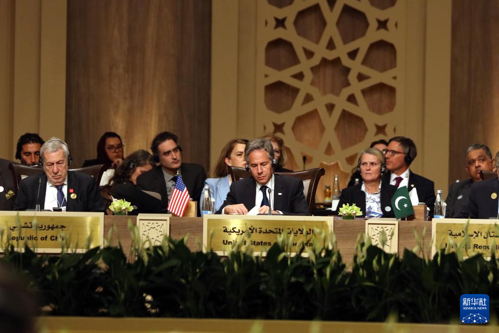 会议由约旦、埃及和联合国联合举办,包括约旦国王阿卜杜拉二世、埃及总统塞西、巴勒斯坦总统阿巴斯、联合国秘书长古特雷斯、美国国务卿布林肯在内的多个国家的领导人或代表及国际组织负责人参会。