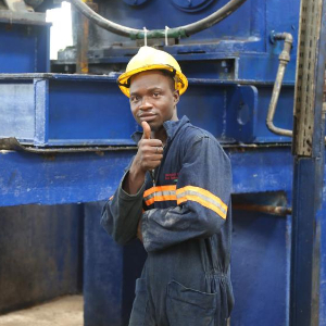2024年6月10日,在科特迪瓦南部城镇达布郊区,美兰橡胶加工厂工人在机器旁竖起大拇指。