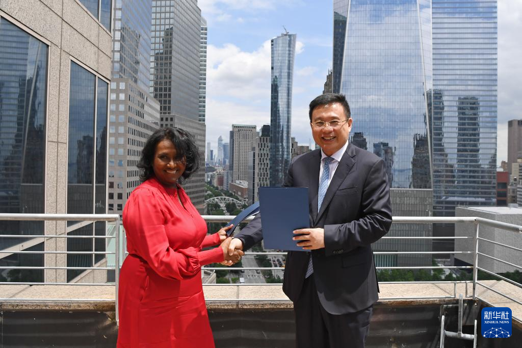 6月12日,新华通讯社社长傅华在美国纽约与美联社社长兼首席执行官戴茜薇交换合作协议。新华社记者 李睿 摄