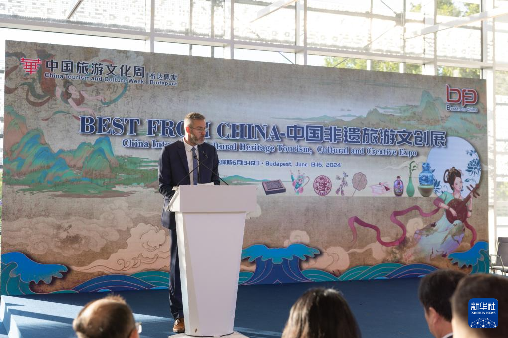 6月13日,在匈牙利布达佩斯,匈牙利国家旅游局局长肯尼德·拉斯洛在2024年布达佩斯中国旅游文化周暨首届中国非遗旅游文创展开幕式上致辞。新华社发(弗尔季·奥蒂洛摄)