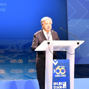 6月12日,在瑞士日内瓦万国宫,联合国秘书长古特雷斯在联合国贸易和发展会议全球领导人论坛上致辞。