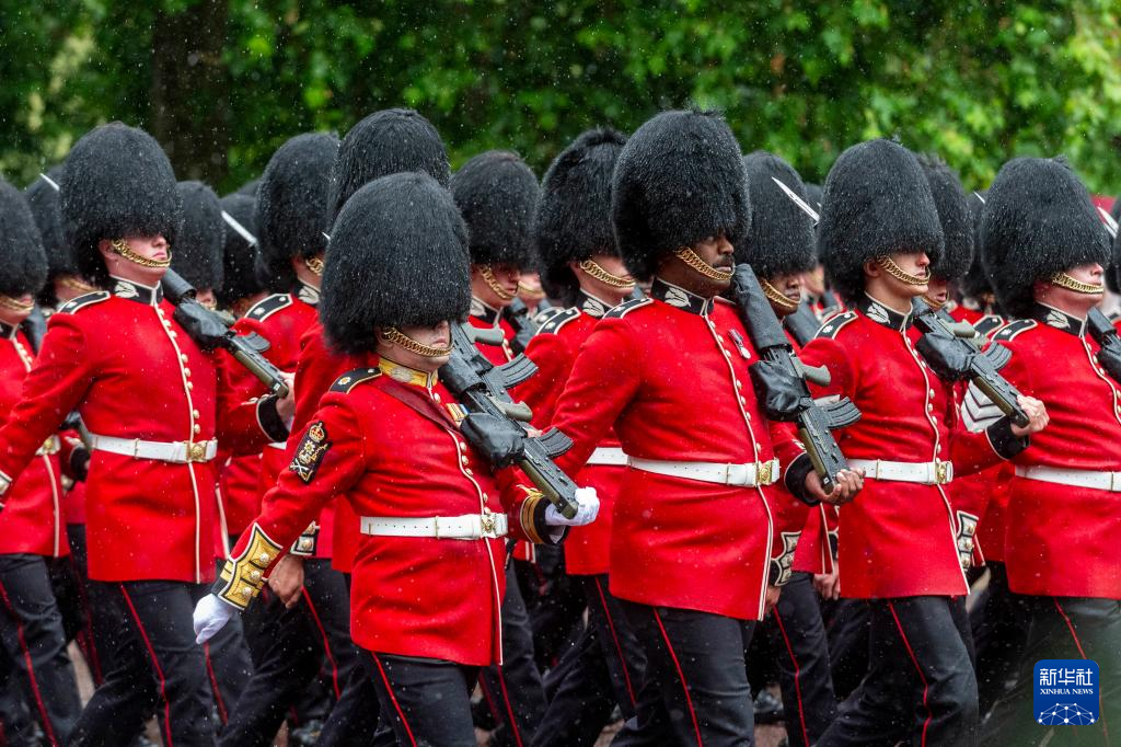 6月15日,在英国伦敦举行的皇家阅兵式上,英国皇家卫队士兵冒雨列队行进。