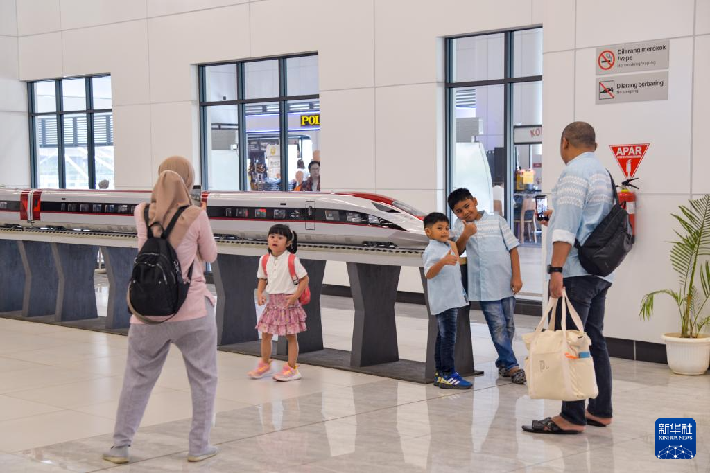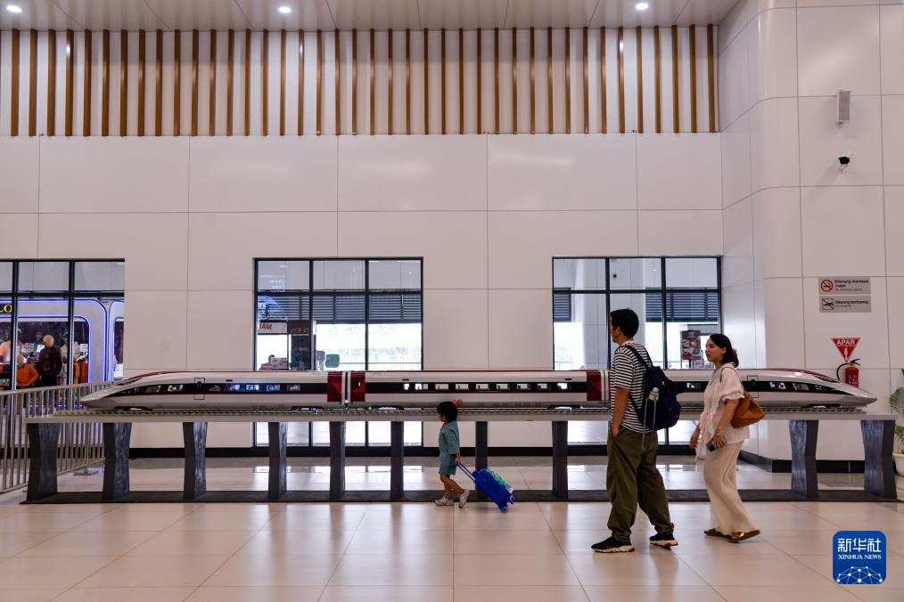 6月17日,在印度尼西亚雅加达哈利姆站候车大厅,乘客观赏高速动车组模型。