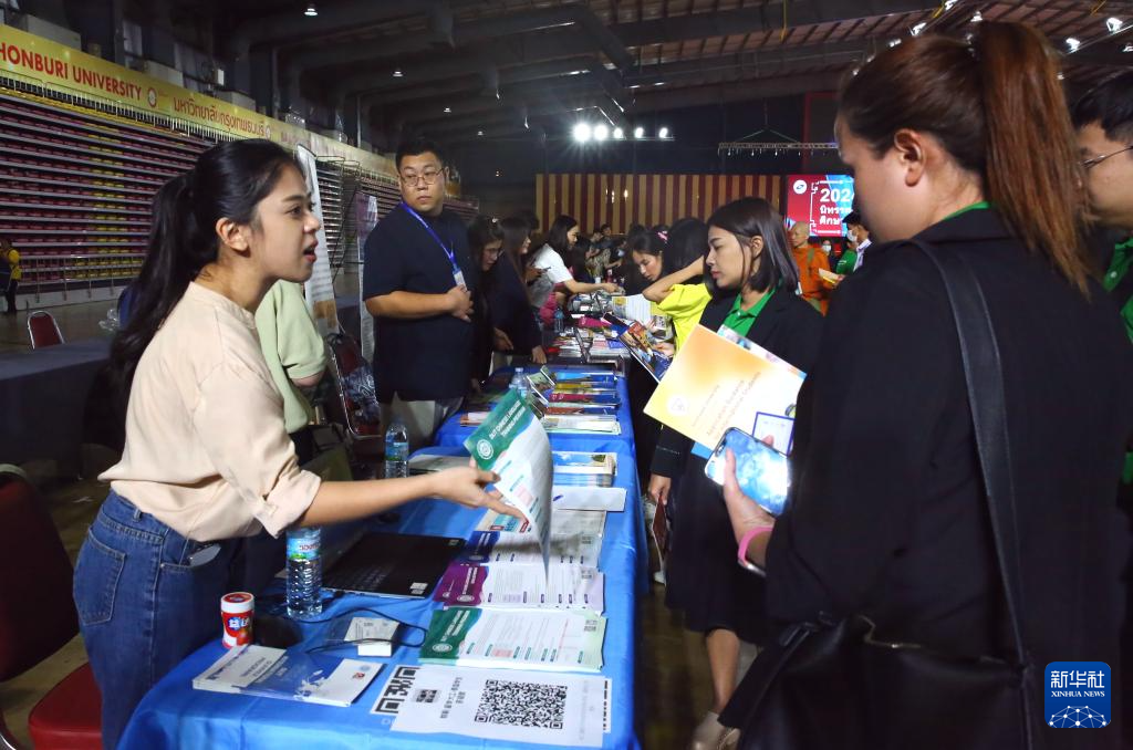 6月22日,在泰国曼谷吞武里大学举办的中国高等教育展上,学生在中国高校展台前了解信息。新华社记者 孙玮彤 摄