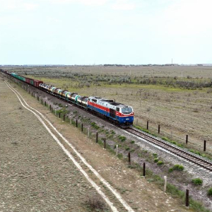 2023年5月12日,在哈萨克斯坦阿拉木图附近,货运列车驰骋于阿拉木图与中国霍尔果斯间(无人机照片)。新华社发(奥斯帕诺夫摄)