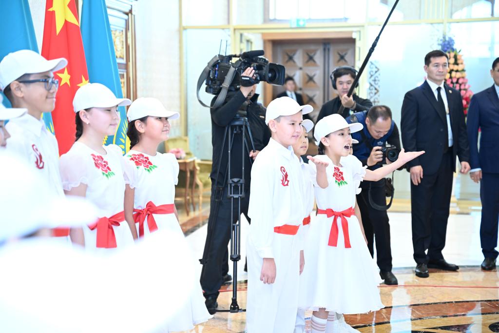 “越过高山,越过平原,跨过奔腾的黄河长江。宽广美丽的土地,是我们亲爱的家乡……”孩子们真挚地歌唱,习近平主席同托卡耶夫总统颔首微笑。