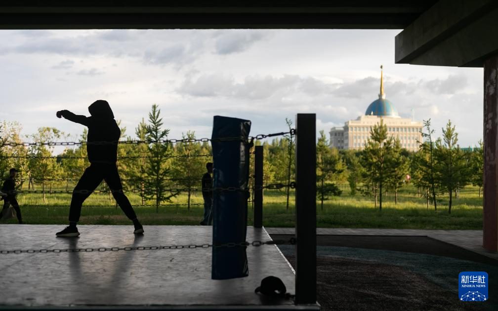 7月2日,在哈萨克斯坦首都阿斯塔纳,一名男子在桥下运动场练习拳击。