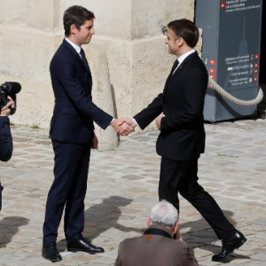 这是2024年3月20日,法国总统马克龙(上右一)在巴黎与总理阿塔尔(上右二)握手的资料照片。