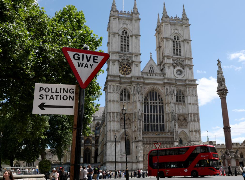 7月4日,在英国伦敦,一辆红色大巴经过威斯敏斯特教堂附近的一处投票站指示牌。新华社记者李颖摄