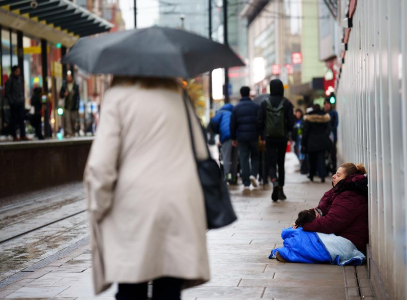 2023年11月22日,在英国曼彻斯特,一名乞讨者坐在路边。新华社发(乔恩·休珀摄)