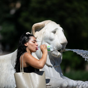 7月14日,一名游客在意大利罗马的狮子喷泉旁饮水。