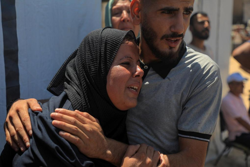7月13日,在加沙地带南部城市汗尤尼斯,人们哀悼在以军袭击中丧生的亲友。新华社发(里泽克·阿卜杜勒贾瓦德摄)