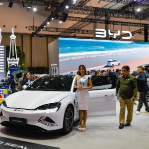 7月18日,在印度尼西亚万丹省唐格朗的印尼会展中心,人们参观2024年印尼国际汽车展上的中国汽车品牌比亚迪展台。