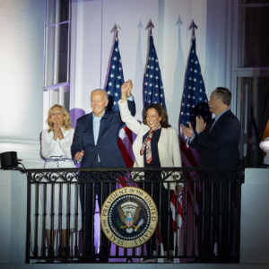 这是7月4日在美国华盛顿白宫拍摄的美国总统拜登(左二)和副总统哈里斯(右二)。新华社记者胡友松摄