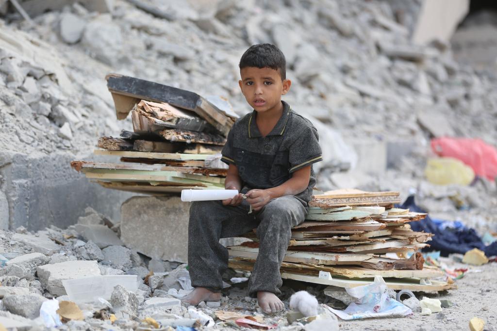 7月26日,在加沙地带中部努赛赖特难民营,一名男孩坐在建筑废墟上。新华社发(马尔万·达乌德摄)