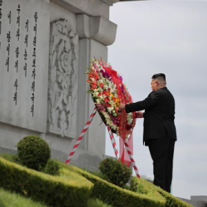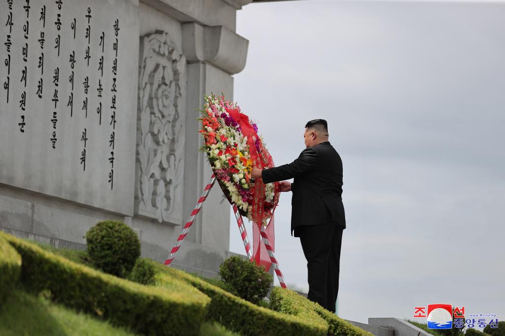这张朝中社发布的照片显示,7月26日,朝鲜劳动党总书记、国务委员长金正恩在首都平壤参谒中朝友谊塔。