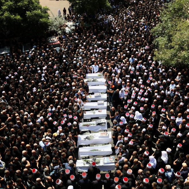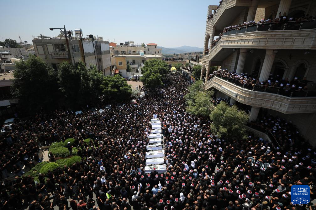 7月28日,在以色列占领的戈兰高地城镇迈季代勒舍姆斯,人们参加火箭弹袭击遇难人员的葬礼。