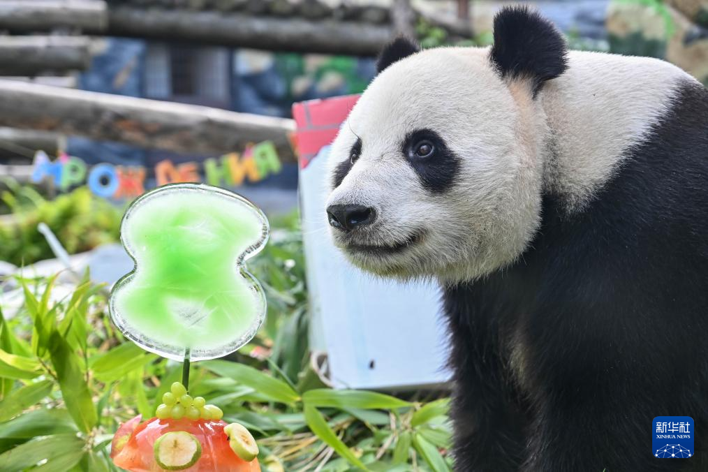 7月30日,在俄罗斯莫斯科动物园,大熊猫“丁丁”享用生日大餐。当日,莫斯科动物园为来自中国的大熊猫“丁丁”庆祝生日。雌性大熊猫“丁丁”2017年7月30日出生于中国四川卧龙神树坪基地,它和大熊猫“如意”于2019年4月29日抵达莫斯科,开启为期15年的旅居生活。新华社记者 曹阳 摄