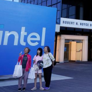 8月1日,游客在美国加利福尼亚州圣克拉拉的英特尔总部留影。