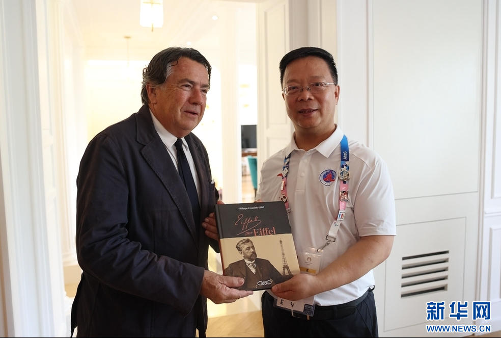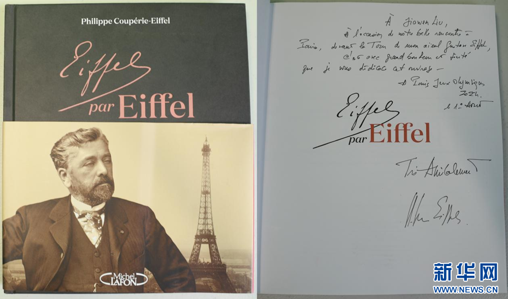 埃菲尔铁塔设计者第四代传人、古斯塔夫·埃菲尔之友协会主席菲利普·库佩里·埃菲尔日前在巴黎接受新华网《国际会客厅》栏目专访后,向新华网赠送他的著作并题词。