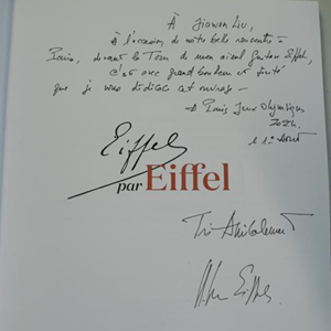 值此巴黎美好的会面之际,在我的先祖古斯塔夫·埃菲尔(设计)的铁塔前面,我非常荣幸和自豪地向您献上这部我签名的作品。