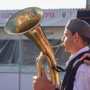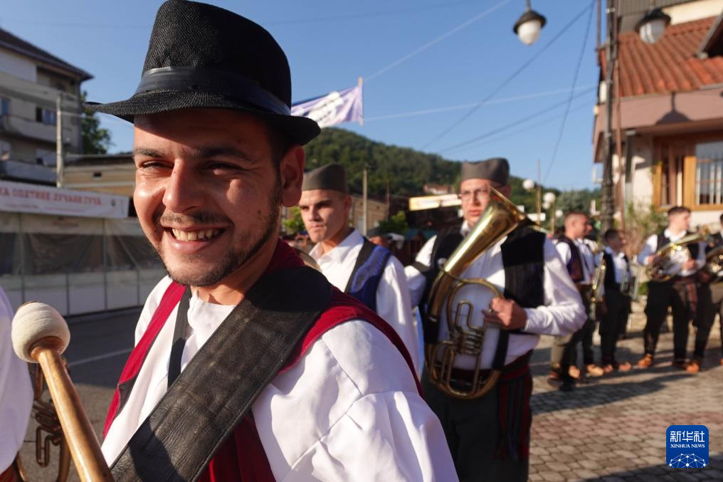 8月4日,在塞尔维亚古查小镇,铜管乐手进行街头表演。
