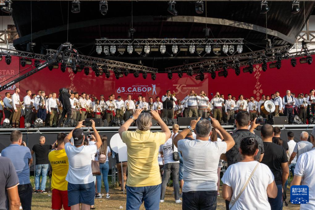 8月4日,在塞尔维亚古查小镇,人们观看铜管乐手同台竞演。