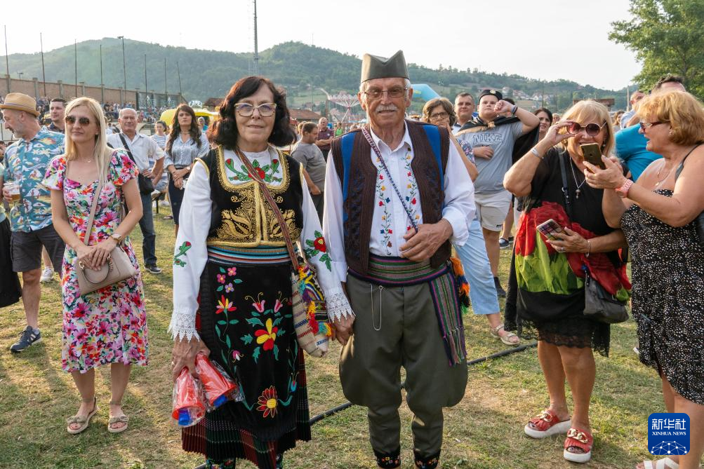 8月4日,在塞尔维亚古查小镇,一对夫妇身着塞尔维亚传统服饰在铜管乐决赛现场观看表演。