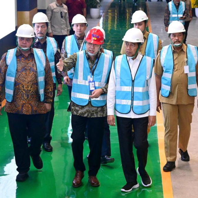 8月7日,印尼总统佐科(中)在印度尼西亚中爪哇省视察贝特瑞新材料集团印尼工厂。