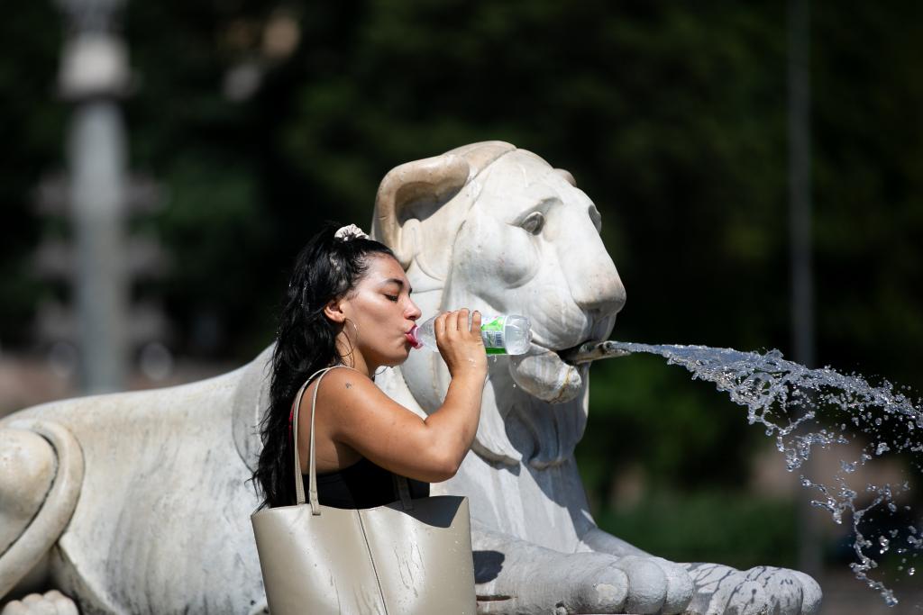 7月14日,一名游客在意大利罗马的狮子喷泉旁饮水。新华社记者 李京 摄