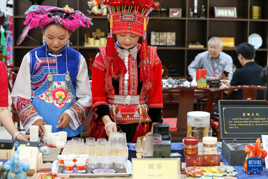 8月9日,工作人员在缅甸仰光举行的“茶和天下·雅集”暨中国云南文化和旅游推广活动上为嘉宾提供茶饮。新华社发(苗觉梭摄)