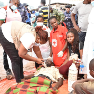8月10日,一名男子在乌干达中部瓦基索区事故发生地附近接受医治。