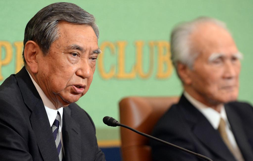 2015年6月9日,在日本东京,日本前内阁官房长官河野洋平(左)发表讲话。当日,河野洋平和前首相村山富市在日本记者俱乐部举行对谈,重申承认殖民侵略历史事实、坚持和平宪法对日本的重要意义。新华社记者马平摄