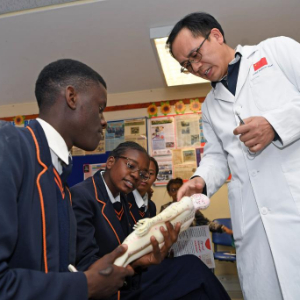 8月14日,在纳米比亚首都温得和克的一所私立学校,中国援纳第15批医疗队队长李邦伟在课堂上为学生们介绍人体经络。