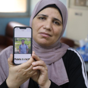 7月29日,来自巴勒斯坦的丽姆·穆罕默德·阿布·塔哈在伊拉克首都巴格达的一家医院向记者展示她在以色列空袭中丧生的儿子的照片。